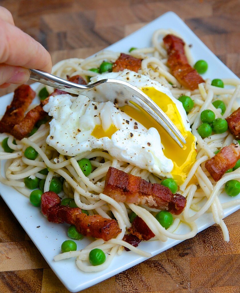- Put hot pasta and peas into a large serving dish. Sprinkle cheese over the noodles and toss with olive oil. Top each serving with a poached egg.